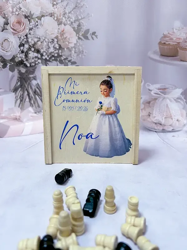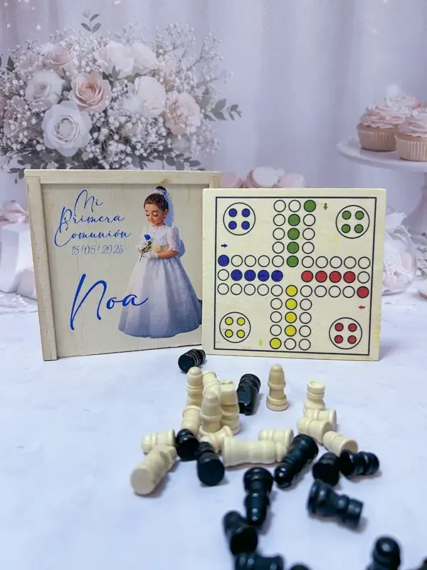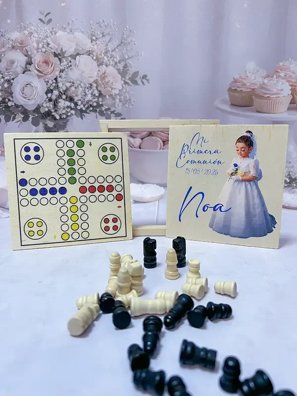 Fabricados en madera natural de alta calidad, estos juegos reunidos incluyen clásicos como oca, parchís, damas, ajedrez o tres en raya, presentados en un formato compacto y elegante. Cada pieza se personaliza con el nombre del niño o niña y la fecha de la comunión, creando un recuerdo único de un día inolvidable.