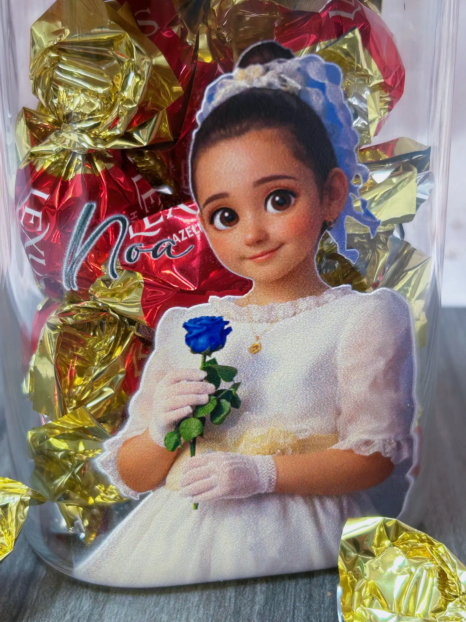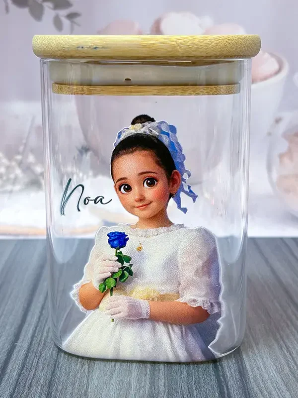 Este tarro de cristal personalizado para comunión se personaliza con la imagen del niño o niña y su nombre, creando un recuerdo único y emotivo. Ideal para rellenar con dulces, chocolates, velas o pequeños detalles, es un regalo práctico y decorativo que gusta a todos.